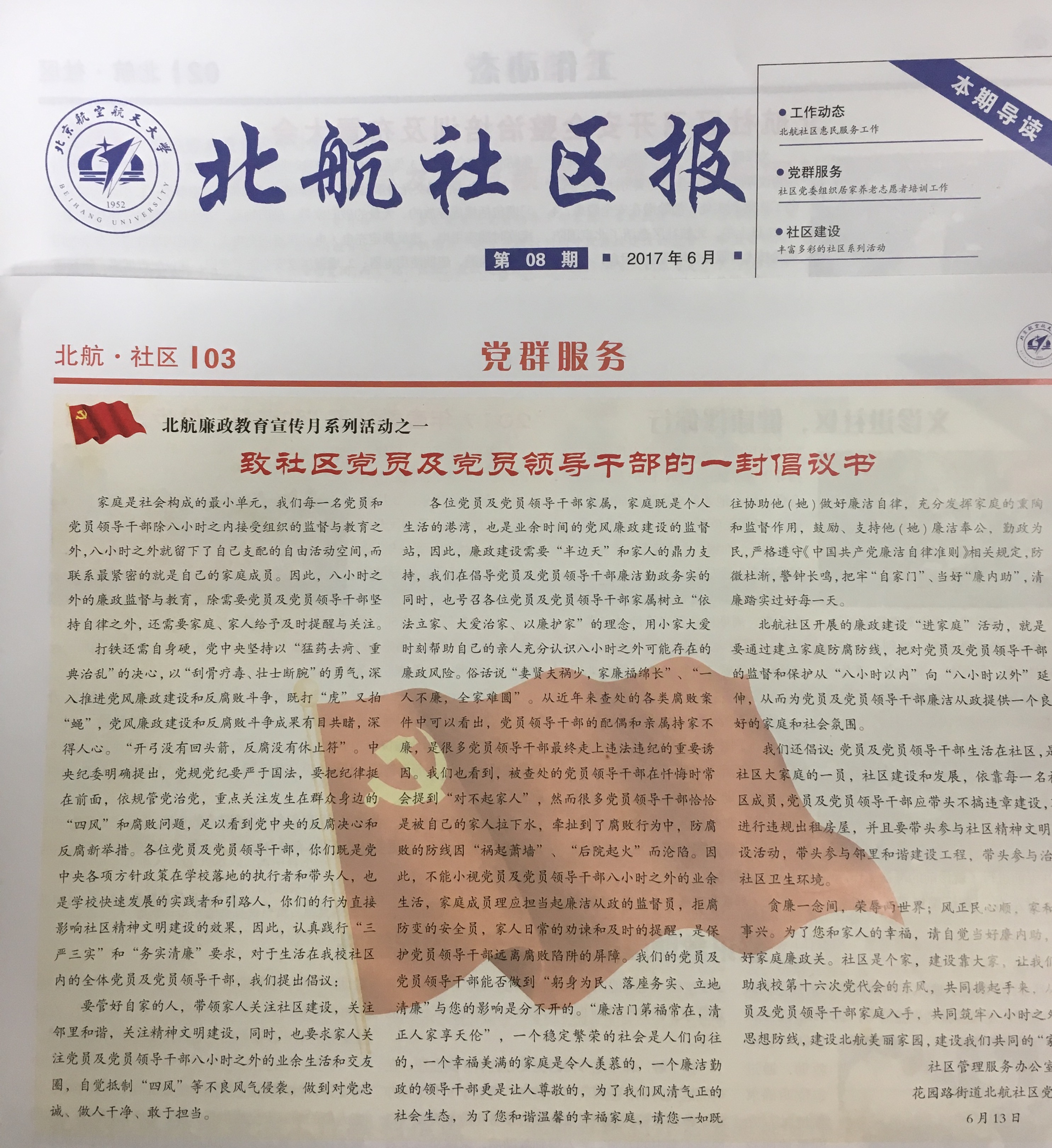 贪廉一念间,荣辱两世界;风正民心顺,家和万事兴。为了您和家人的幸福,请自觉当好廉内助,把好家庭廉政关。社区是个家,建设靠大家,让我们借助我校第十六次党代会的东风,共同携起手来,从党员及党员领导干部家庭入手,共同筑牢八小时之外的思想防线,建设北航美丽家园,建设我们共同的“家”。